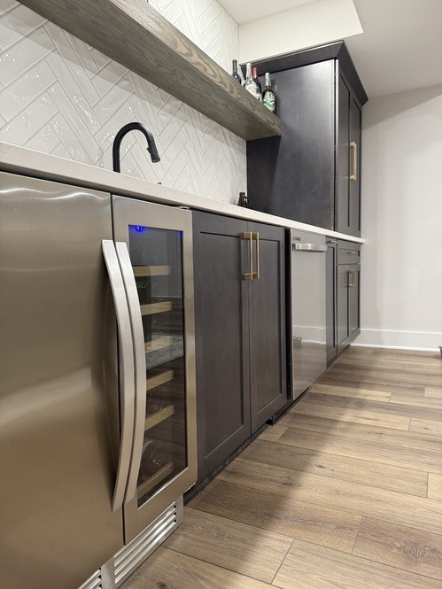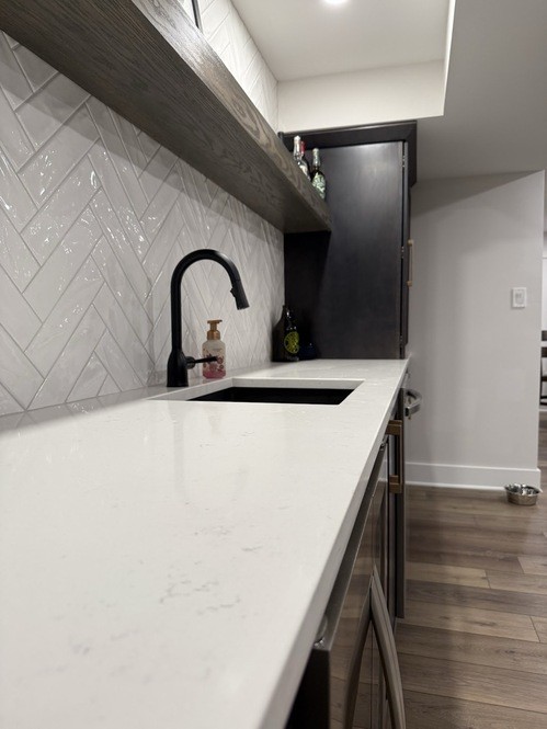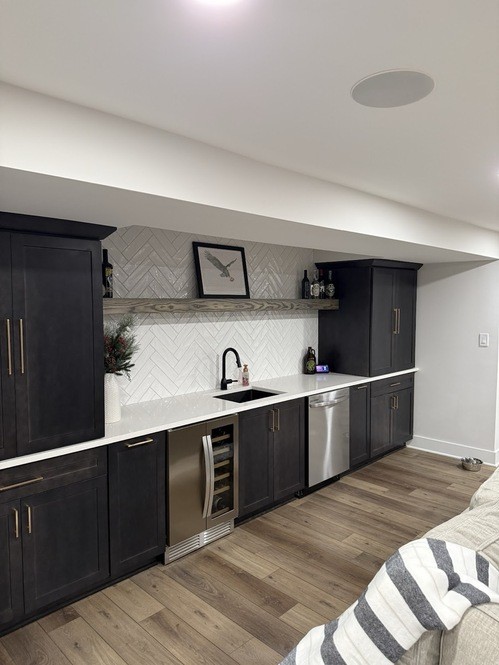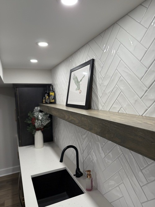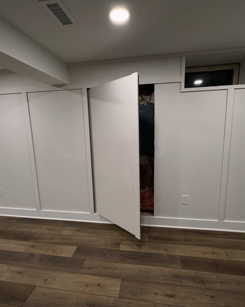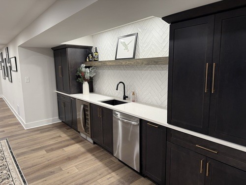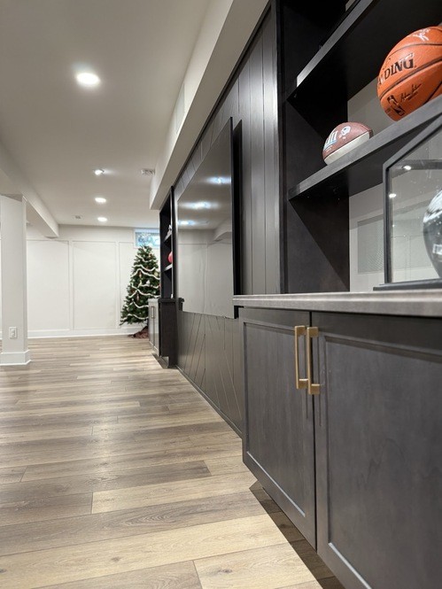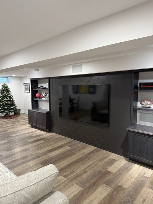 A fresh basement remodel in Powell, Ohio featuring a custom bar, a bold TV feature wall, and a hidden Murphy door that conceals the electrical panel for a clean, seamless look. A sleek, modern basement finishing project built for entertaining and everyday comfort.